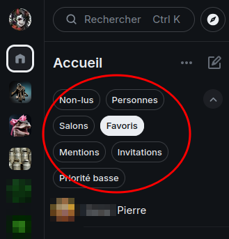 vpour les afficher tous.En cliquant sur un des filtres, la liste de salons affichés s'adapte pour n'afficher que ceux correspondants au critère : par ex. uniquement les non-lus, uniquement les personnes (1 à 1), les favoris ou les invitations à traiter.