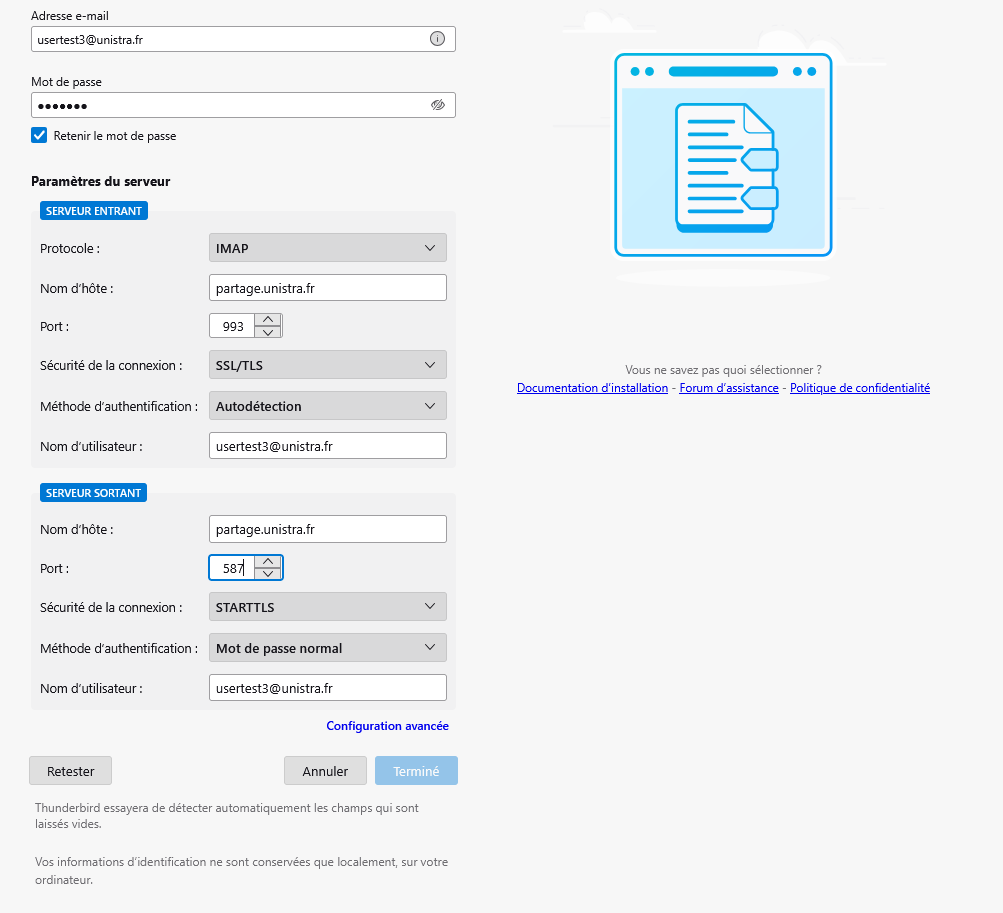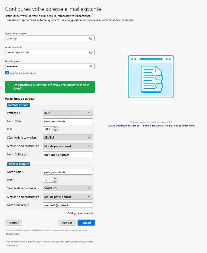 Vous pouvez cliquer sur "Re-tester" pour vérifier que les paramètres saisis sont corrects, puis