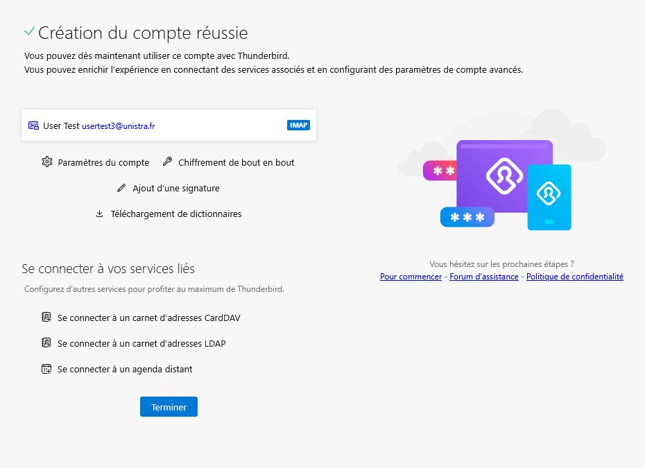 La configuration de votre client de messagerie est terminée. Vous avez maintenant accès à votre boite aux lettres.