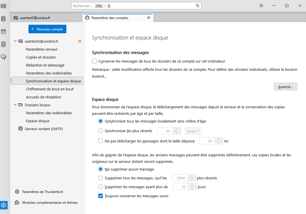 Si votre poste est géré par la Direction du numérique, vous n'avez pas à configurer vous-même Thunderbird. La configuration sera automatiquement déployée sur votre ordinateur.support@unistra.fr