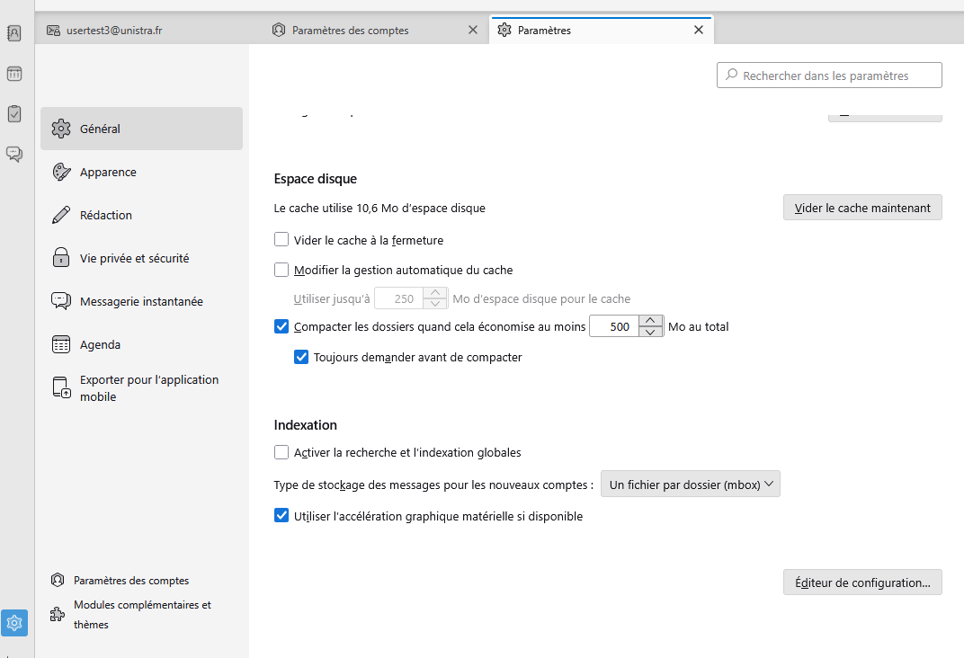 Afin d'augmenter les performances de Thunderbird, vous pouvez modifier certaines options.