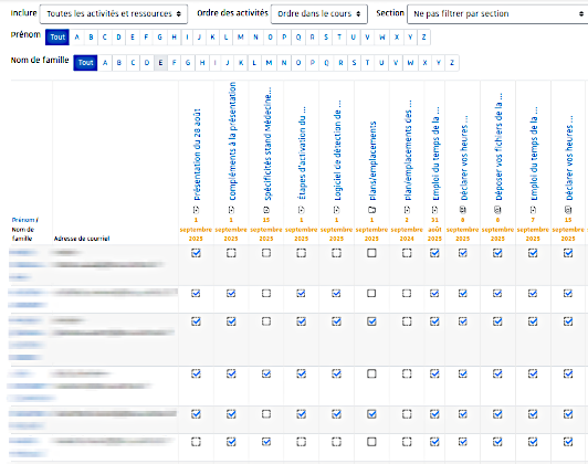 La plate-forme vous affiche un tableau synthétique avec en abscisse les activités et les ressources de votre cours sur lesquelles vous avez activé le suivi d'achèvement, et en ordonnée vos étudiants.