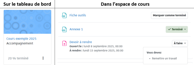En plus de ces 2 indications, vous pouvez ajouter dans votre espace de cours un bloc Progression.