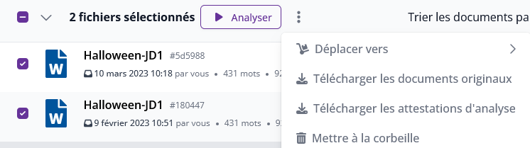 Alternative : cliquez sur la coche à gauche du document, puis une mention « fichiers sélectionnés » apparaît : cliquez sur les 3 points puis à droite du résultat de l'analyse et cliquez ensuite sur Mettre à la corbeille