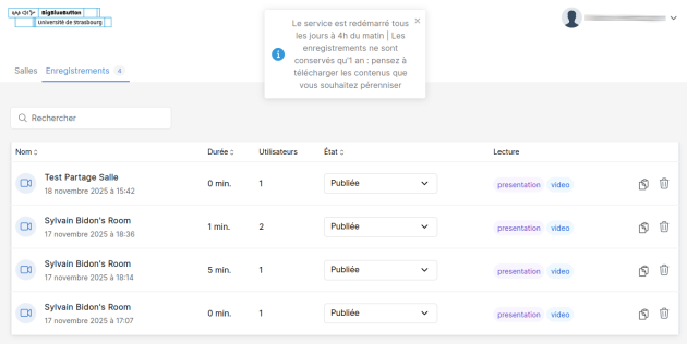 Cette bannière peut être utilisée pour vous transmettre des informations sur la vie du service ou la conservation de vos enregistrements par exemple.
