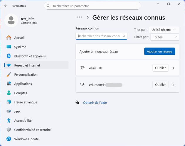 Oubli d'un réseau Wi-Fi sur Windows 11⚓Il est nécessaire de réaliser cette procédure si vous rencontrez des difficultés pour configurer votre connexion wi-fi au réseau eduroam et osiris-lab.Procédure : Étapes de configuration⚓ProcédureCliquer avec le bouton droit sur l'icône qui représente une mappemonde dans la barre des tâches (à côté de la date et de l'heure).⚓Dans la zone située en bas à droite du bureau, faire un clic droit sur l'icône représentant le réseau sans fil.Cliquer sur Paramètres réseau et InternetÀ gauche, sélectionner Réseau et InternetPuis, à droite, cliquer sur la tuile wi-fi ou sur sa flèche >.Cliquer ensuite sur la tuile Gérer les réseaux connus ou sur sa flèche >.Sur la tuile eduroam, cliquer sur le bouton Oublier.⚓RésultatVous pouvez reprendre la procédure de configuration du wi-fi