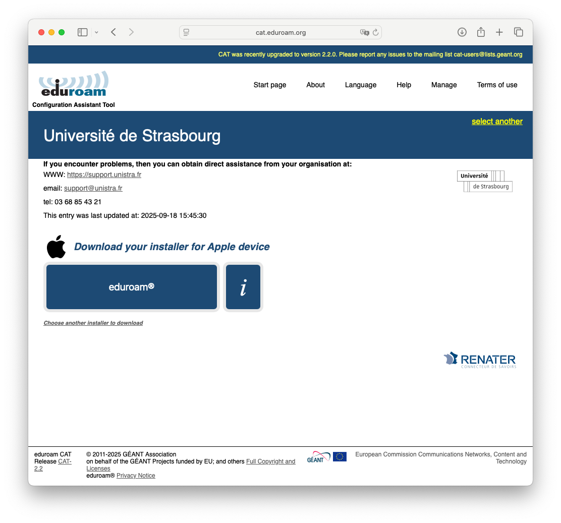 Il est nécessaire d'installer le profil de connexion sécurisée à télécharger sur le site https://cat.eduroam.org/?idp=233