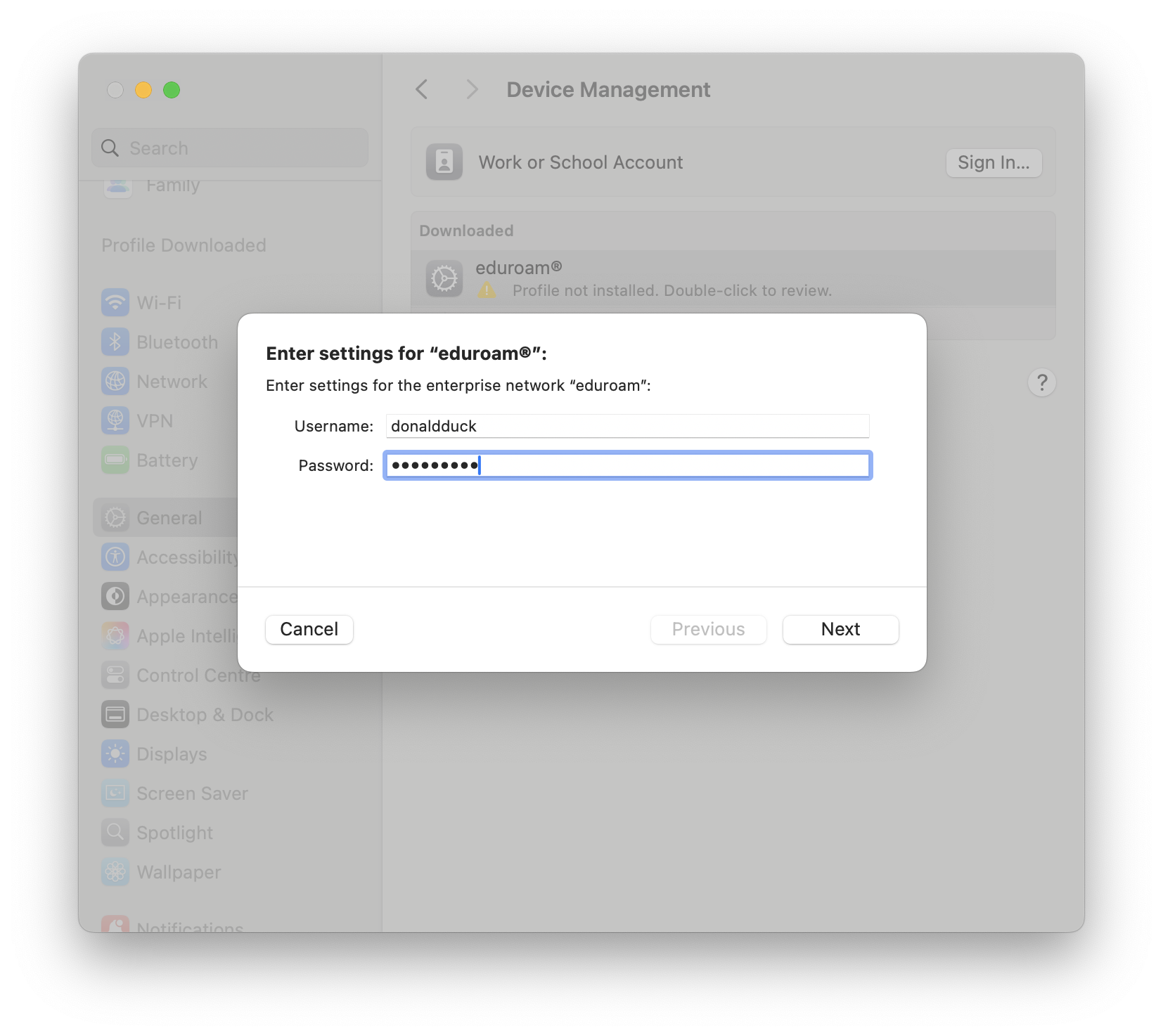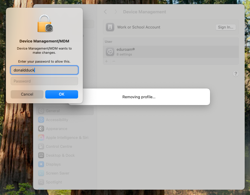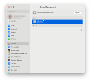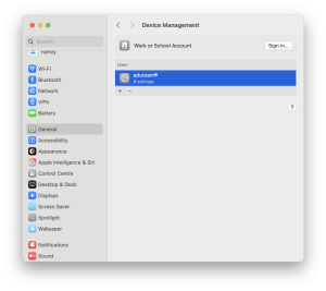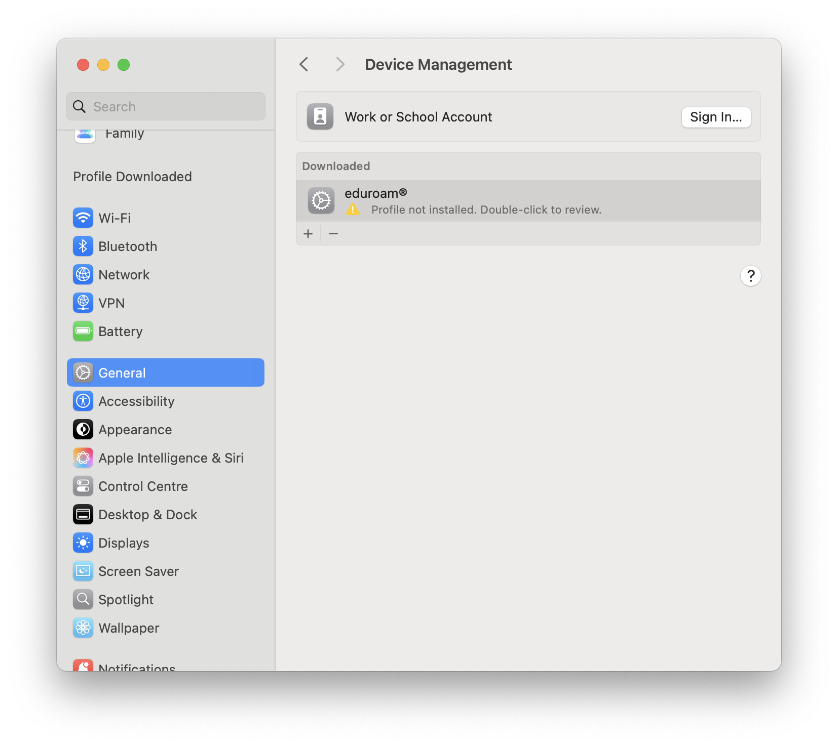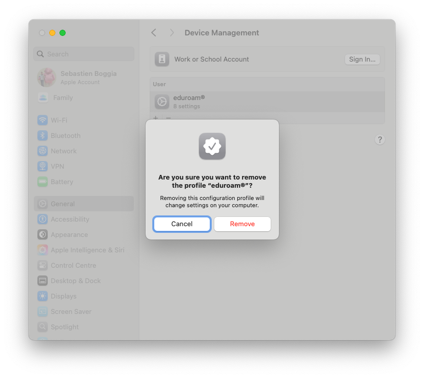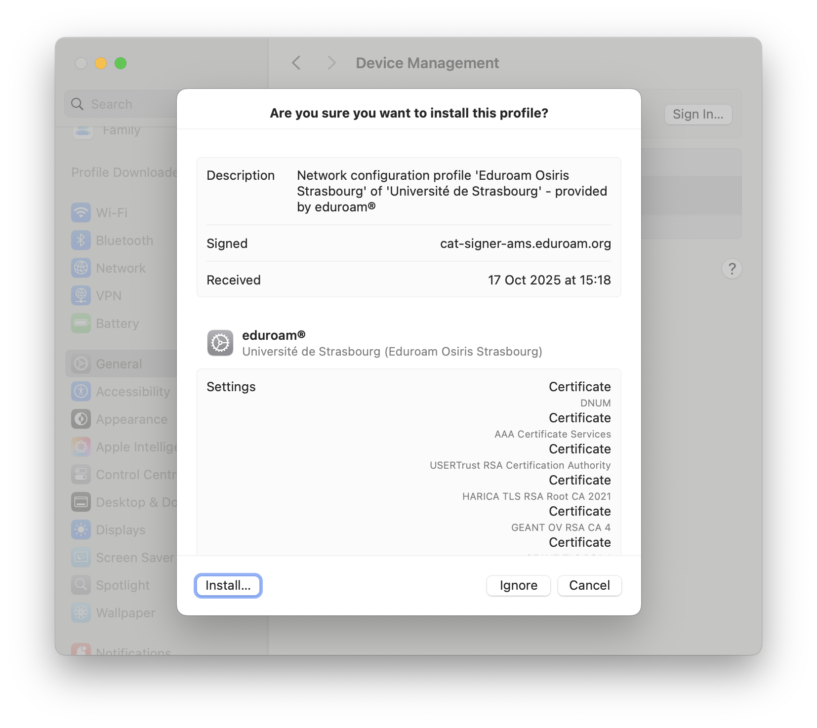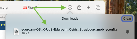 Si un profil de connexion eduroam est déjà installé sur l'appareil MacOS, l'installation du nouveau profil devrait le substituer à l'existant. Passer directement à l'étape 2.