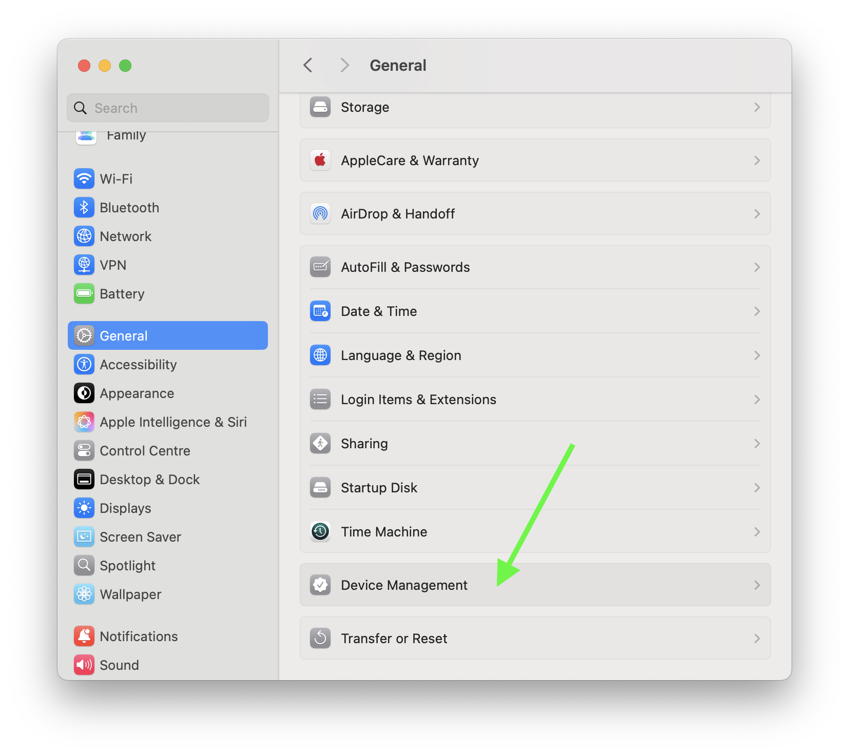 - Dans la fenêtre qui s'affiche, cliquer sur général puis sur Device Management (Gestion de l'appareil)