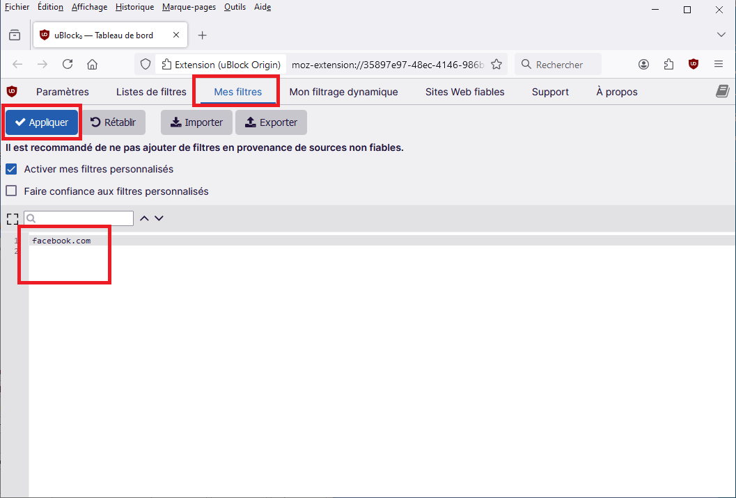 Configuration de l'extension « uBlock Origin »