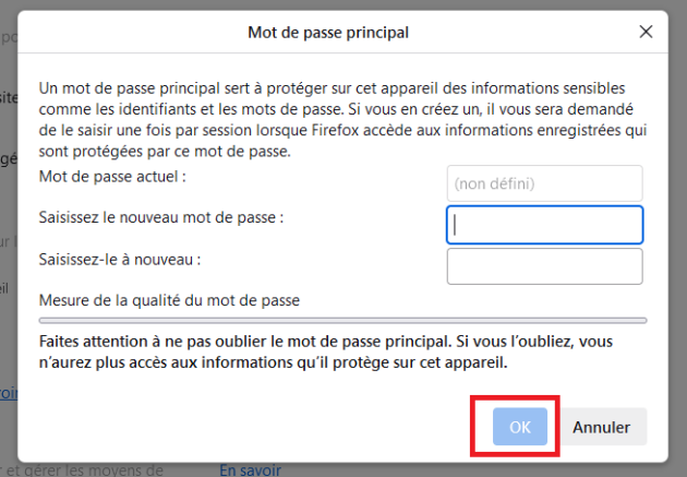 Une fois votre mot de passe principal défini, il faut cliquer sur « Ok ».